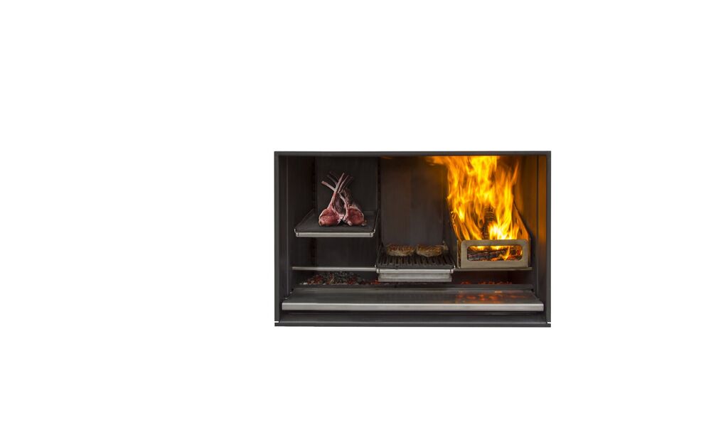 947w x 655h viewable glass size. 5 Year firebox Warranty, 2 Year total Warranty, Optional Extras include: 13 Point Adjustable-Height Racking, In-Built Hanging Bar (included), Ember Generator, Fat Drip Tray, Metal Hooks, Pizza Oven Accessory, Heat Resistant Gloves (included), Hideaway Storage for Cooking Plates (included), Cast Iron Cooking Grill, Flat Plate, Fire Spear. *Extras Pizza Oven, Flue