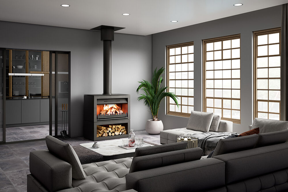 Heats up to 100m2, Heat output up to 15kW, Open fronted type, Contemporary style, Convection heating sytle, Woodstacker or Inbuilt display, 3 speed remote control fan, Australian Made