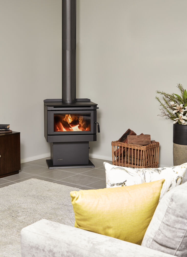 Heats up to 180m2, 69.0% Heating efficiency, 0.9g/kg Particulate emission, 3-Speed fan, Firebrick lined, 8mm steel baffle plate, Dual pre-heated primary air, Cool-touch casing, Australian made, with 10 Year firebox warranty